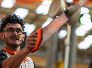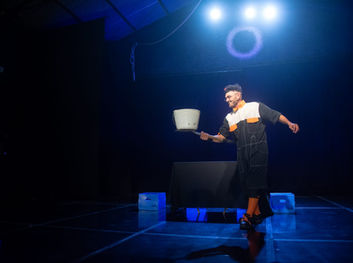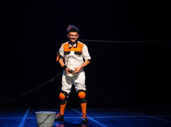 La escena se presenta como una construcción en curso, donde todo puede caer o cambiar de lugar. Con una energía cercana al clown físico y una relación constante con los objetos, el artista crea situaciones absurdas, peligrosas y divertidas, invitando a imaginar otras formas de habitar el caos. Una dramaturgia del riesgo y del juego.